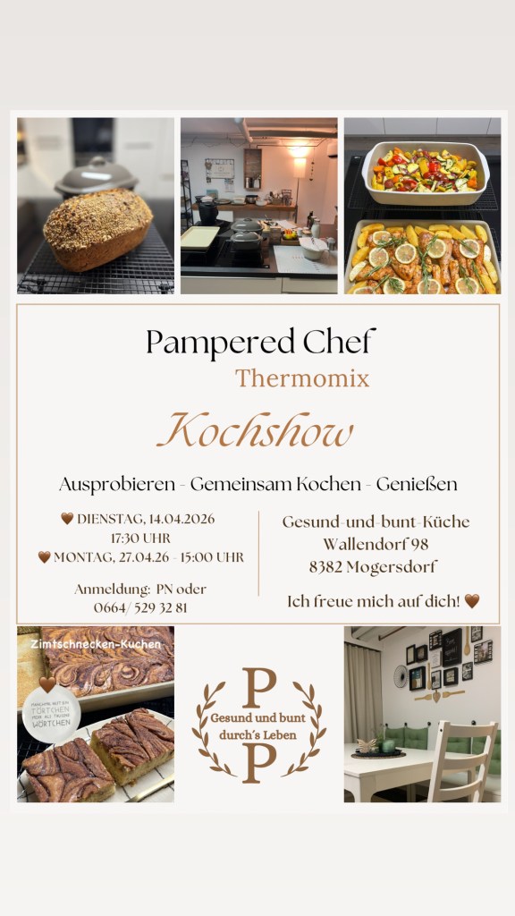 Schreibe mir gerne eine Nachricht oder rufe mich einfach unter 0664/ 529 3281 an, um einen Termin für eine individuelle Ernährungsberatung zu vereinbaren, um Pampered Chef Produkte zu erweben, einen Termin für ein unverbindliches Showkochen zu vereinbaren oder um den Thermomix kostenlos zu testen!