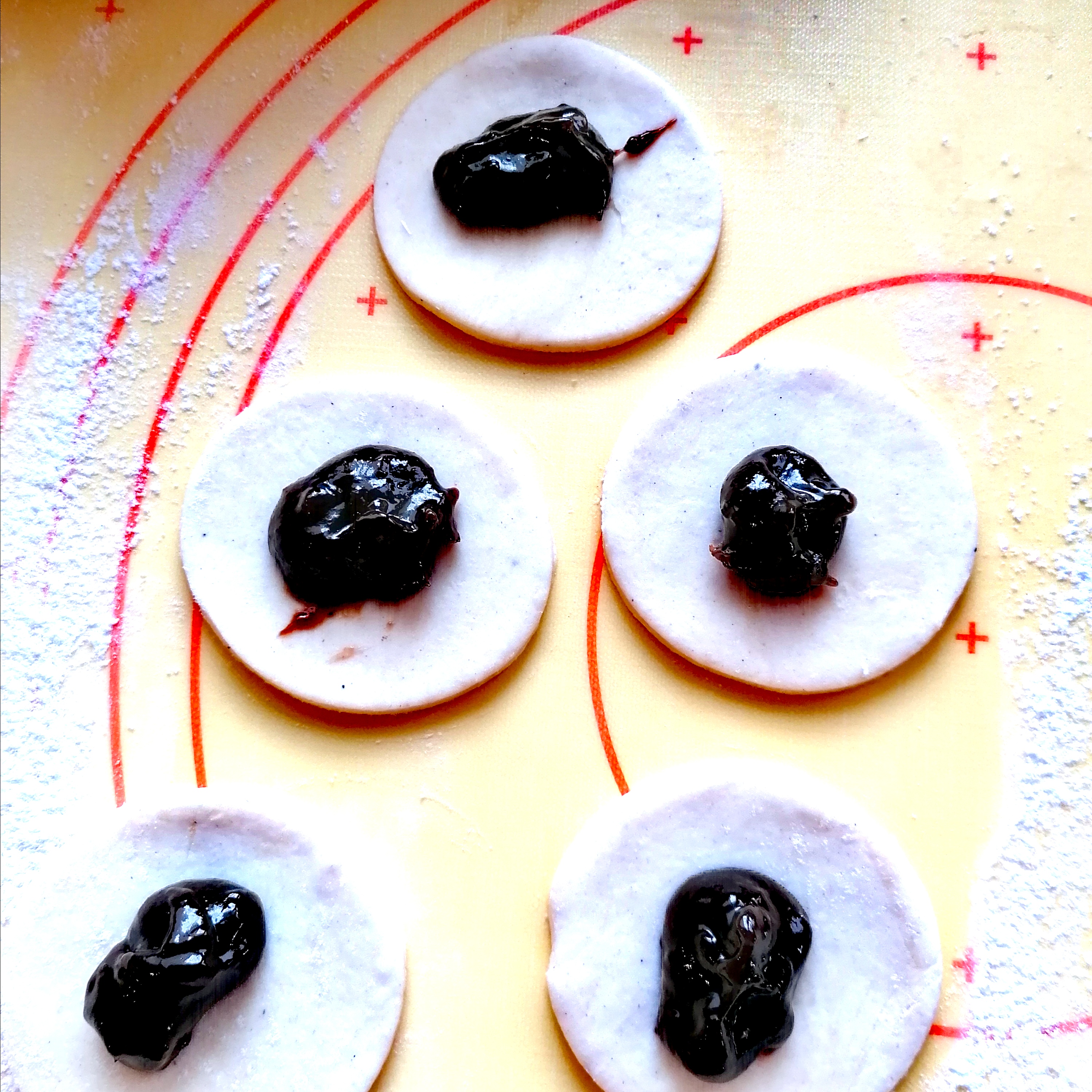 In die Mitte der Kreise je einen Klecks Powidl geben, zu Halbmonde zusammenschlagen und die Ränder gut andrücken. Auf ein mit Backpapier belegtes Blech setzen, mit Eigelb bestreichen und ca. 15-20 Minuten goldgelb backen.