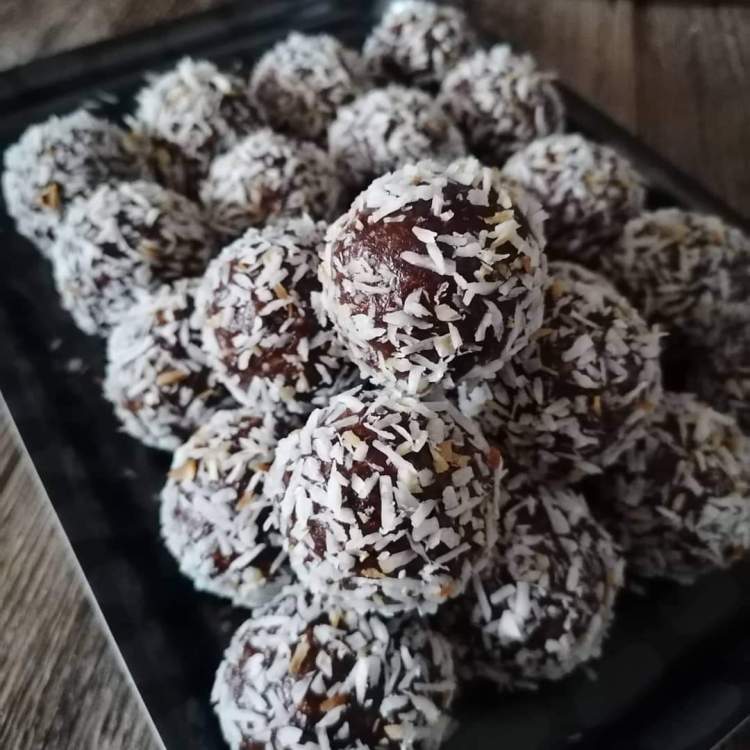 Mit einem Esslöffel etwas Teig abstechen und mit leicht angefeuchteten Handflächen zu Kugel formen und in den gerösteten Kokosflocken wälzen.