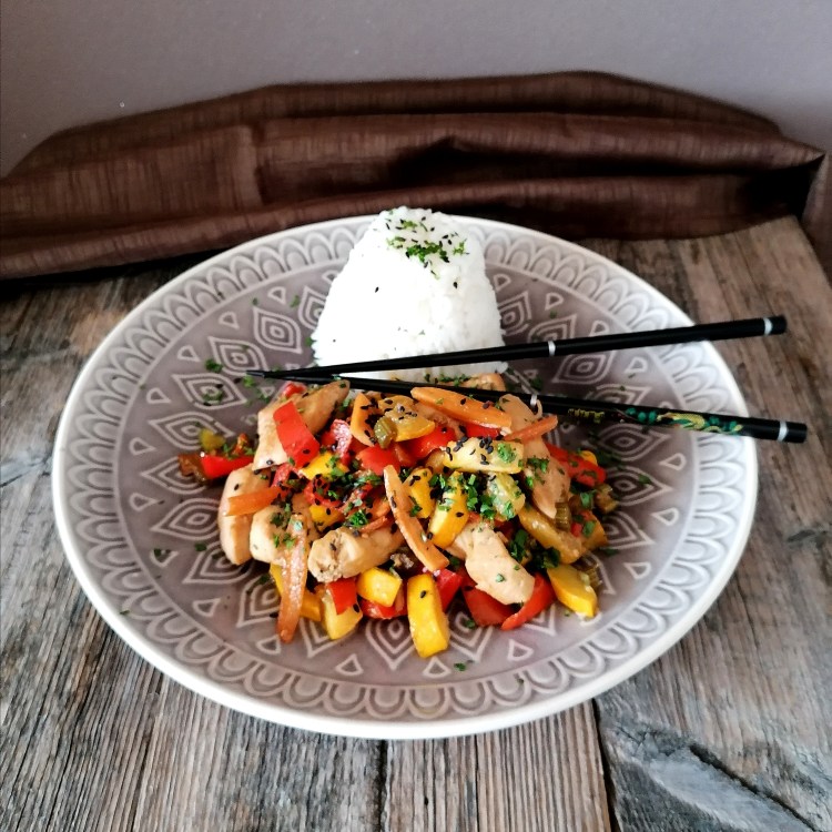 Sesamöl in einer Pfanne oder in einem Wok erwärmen und die Hühnerfiletstreifen unter Rühren anbraten. Das geschnittene Gemüse dazugeben und solange weiterbraten bis das Gemüse weich ist, aber trotzdem noch Biss hat.