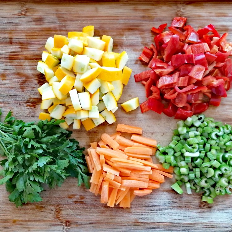 Das Gemüse putzen & waschen. Die Karotten in feine Stifte, den Stangensellerie in Scheiben, die Zucchini und den Paprika würfelig schneiden.