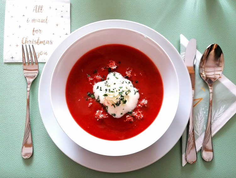 Die Suppe mit einem Klecks Schlagobers, frisch geriebenem Kren und gehackter Petersilie anrichten.