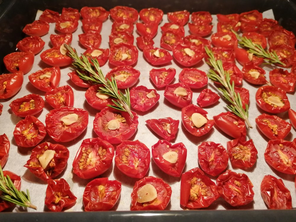 Tomaten waschen, halbieren, Strunk entfernen, mit der Schnittfläche nach unten auf den Backblechen verteilen. Jedes Blech einzeln 15 Minuten backen, bis die Haut sich von den Tomaten löst. Haut abziehen Tomaten auf ein Blech mit hohem Rand oder in einen Bräter leeren.