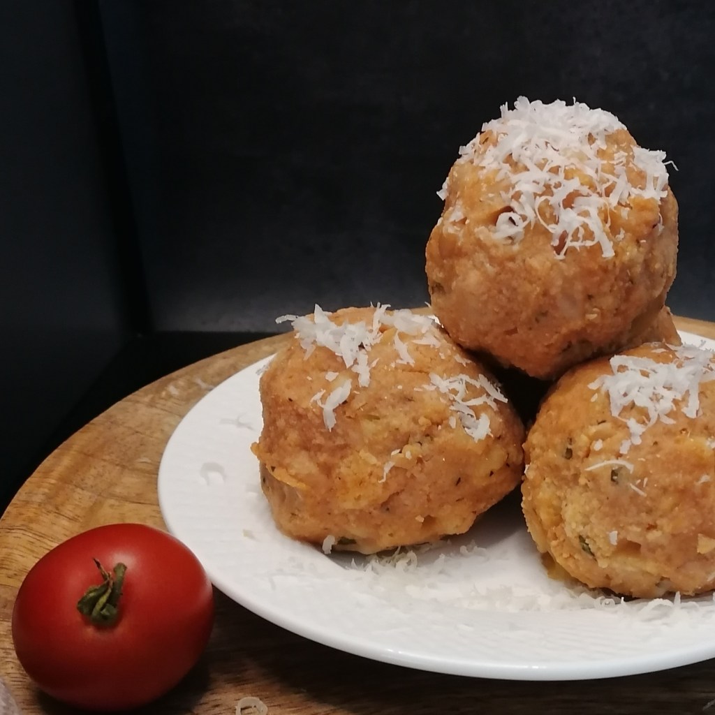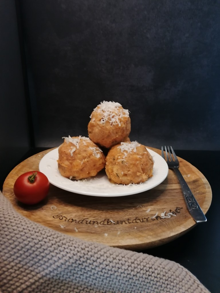 Bei den Semmelknödeln habe ich anstatt der Milch passierte Tomaten und Gemüsebrühe genommen und mit klein geschnittenem Mozzarella verfeinert.