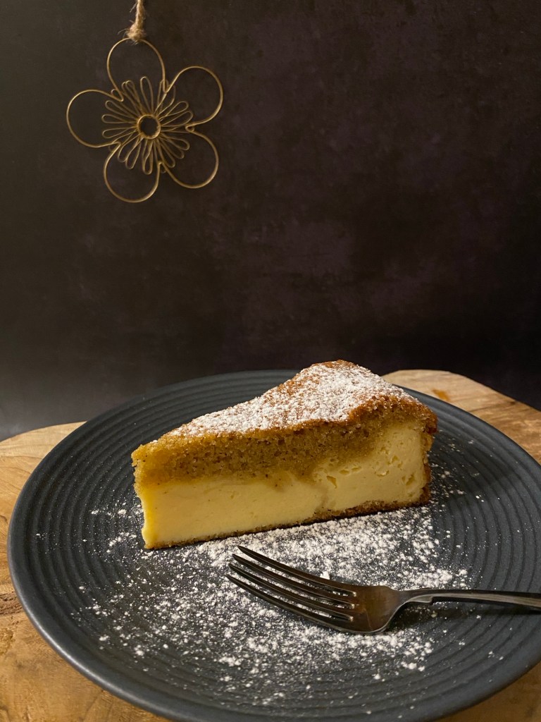 DREH-DICH-UM deswegen, weil sich die Schichten des Kuchens während der Backzeit umdrehen, sodass der Rührteig am Ende der Backzeit oben und die Topfenmasse unten ist.